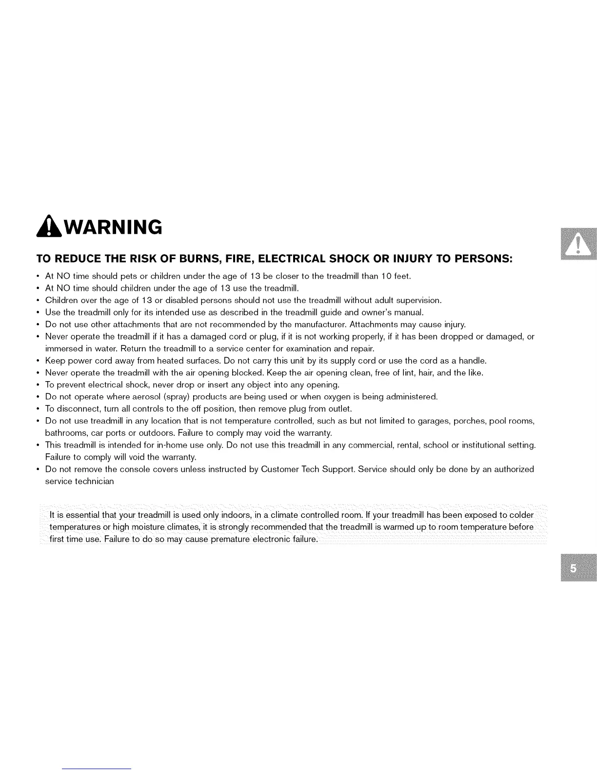 temperatures or high moisture climates, it is strongly recommended that the treadmill is warmed Up to room temperature before ....