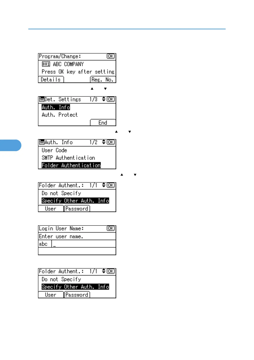 11. Select [Specify Other Auth. Info] using [ ] or [ ], and then press [User].