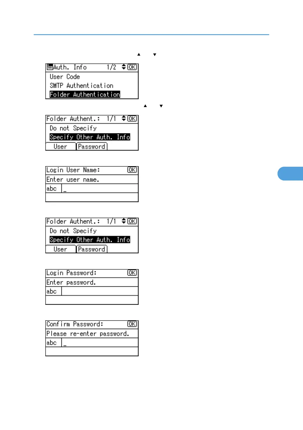 11. Select [Specify Other Auth. Info] using [ ] or [ ], and then press [User].