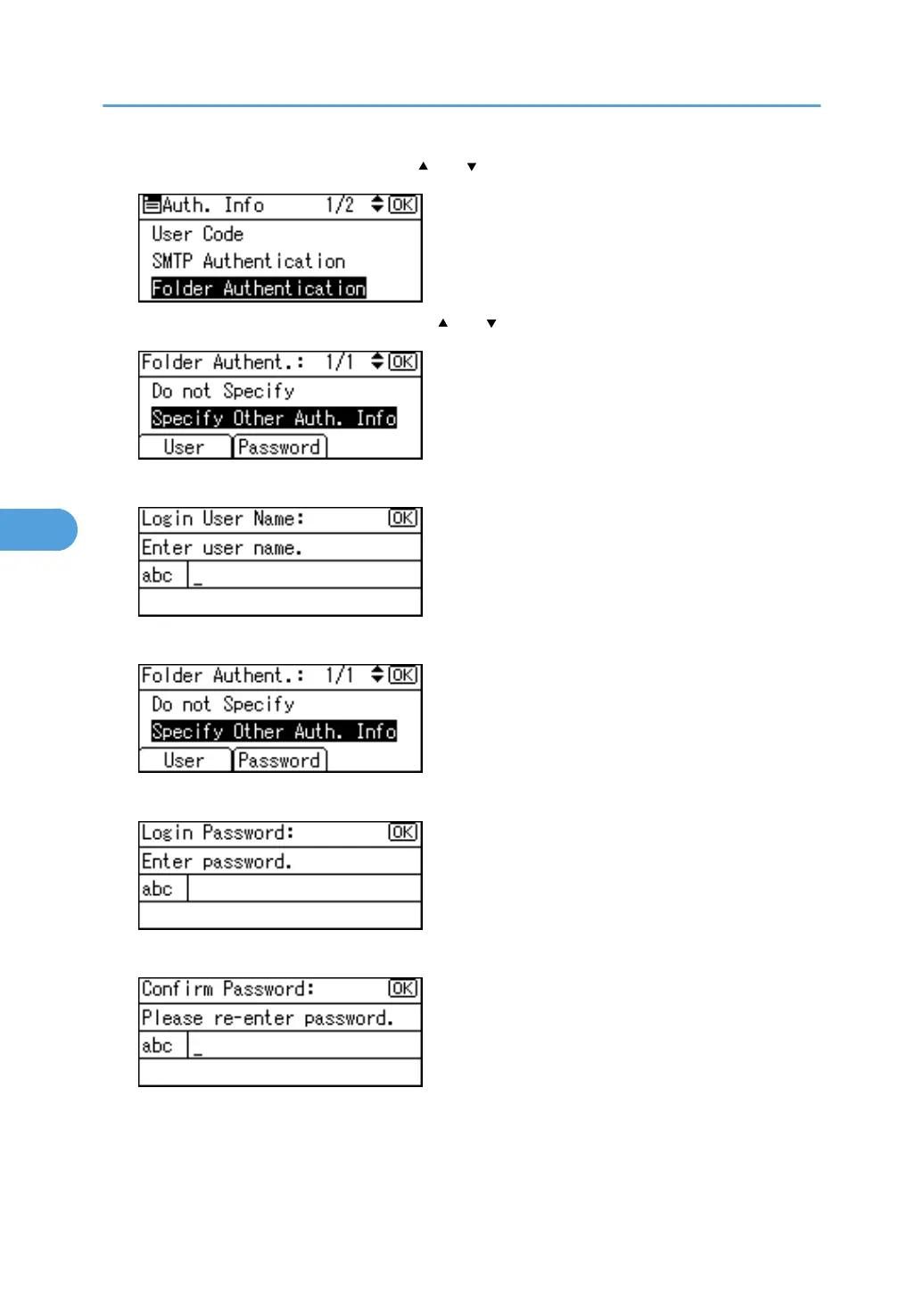 11. Select [Specify Other Auth. Info] using [ ] or [ ], and then press [User].
