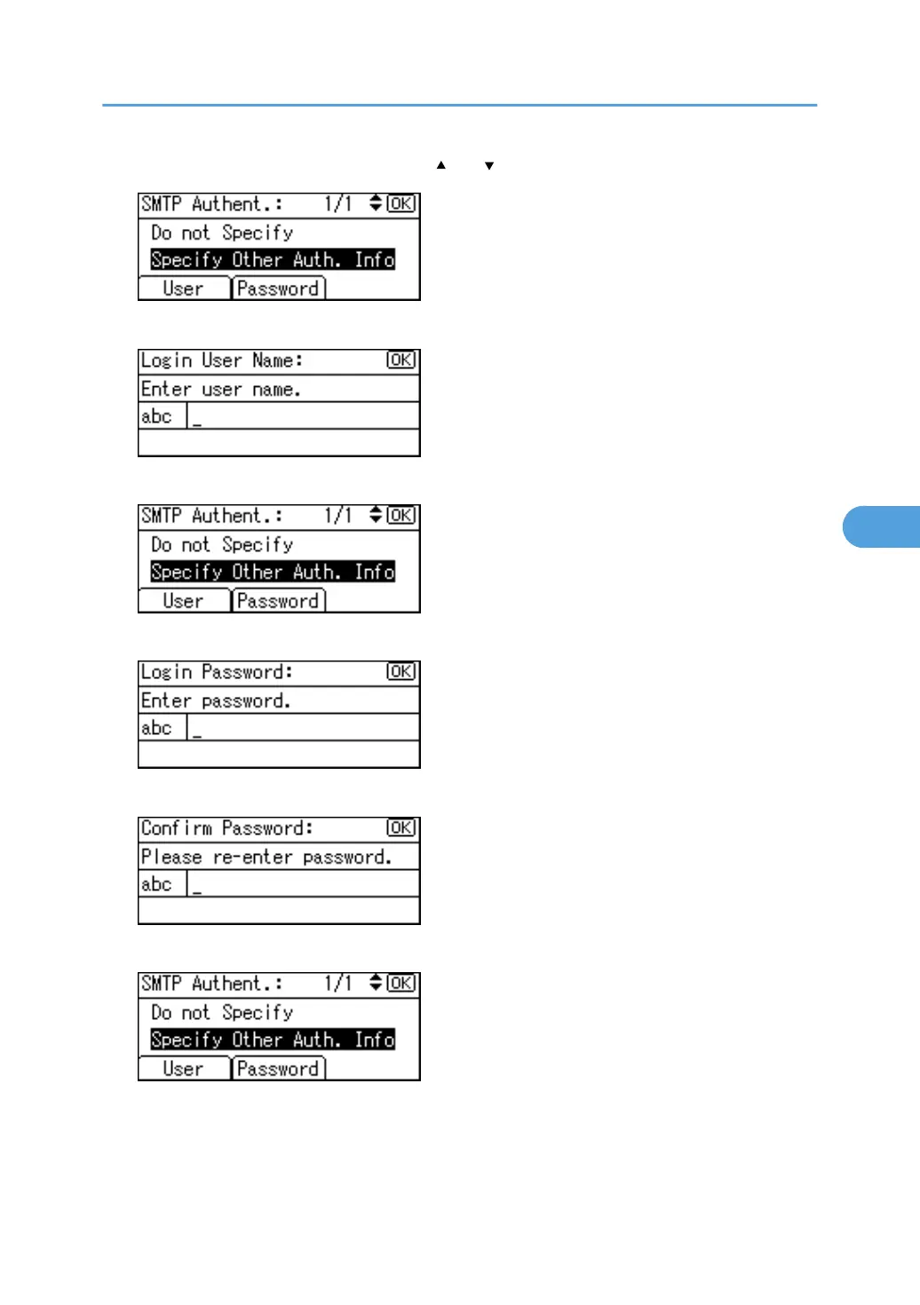 11. Select [Specify Other Auth. Info] using [ ] or [ ], and then press [User].