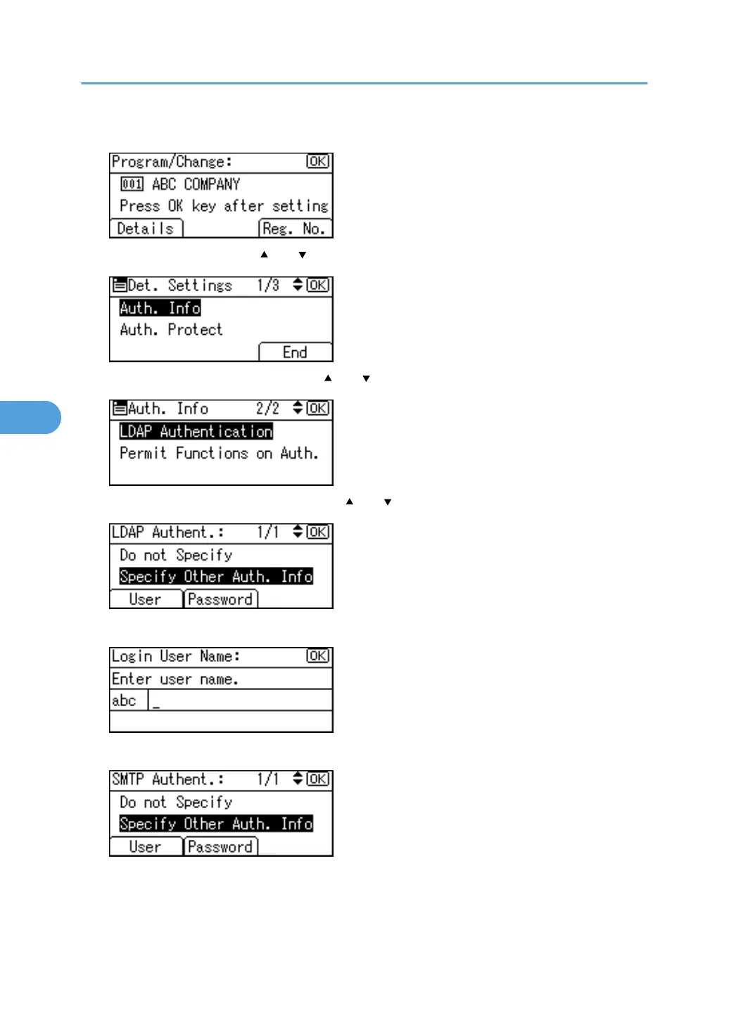 11. Select [Specify Other Auth. Info] using [ ] or [ ], and then press [User].