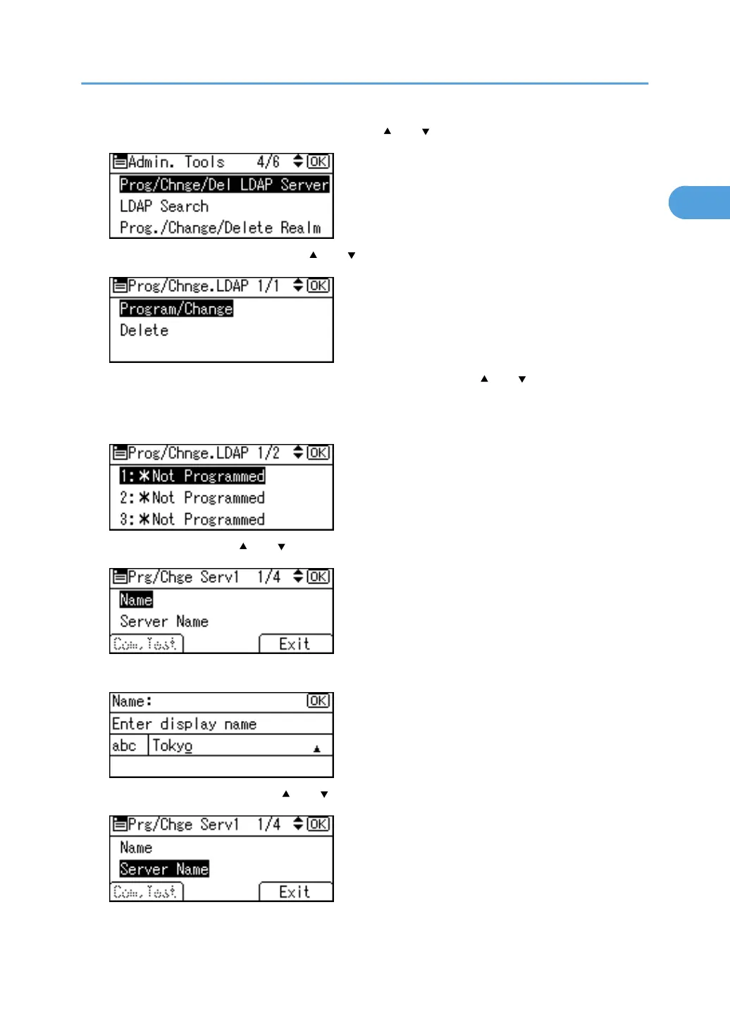 6. Select the LDAP server you want to program or change using [ ] or [ ], and then press the