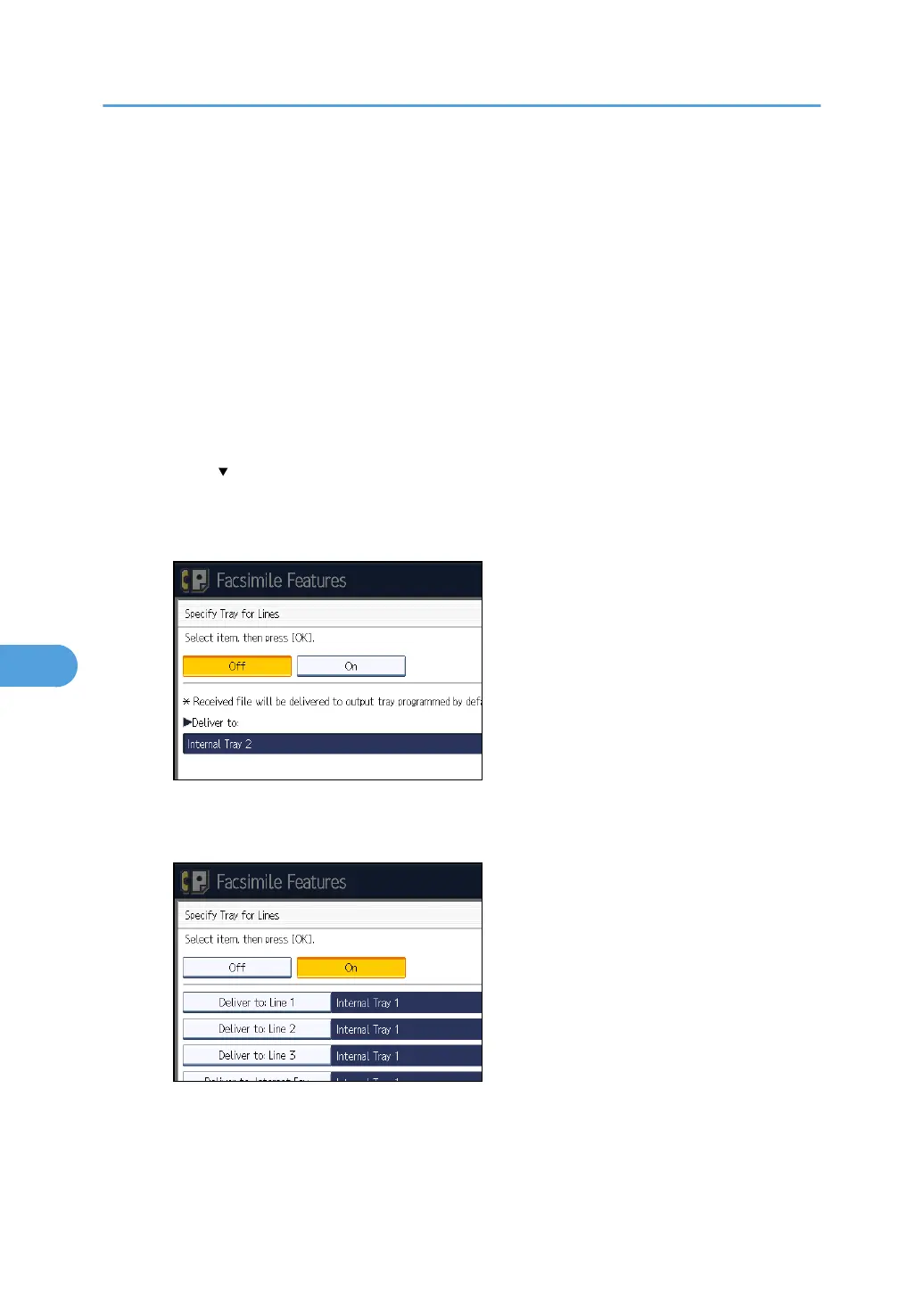 If you select [Off], the received fax is delivered to a default tray.