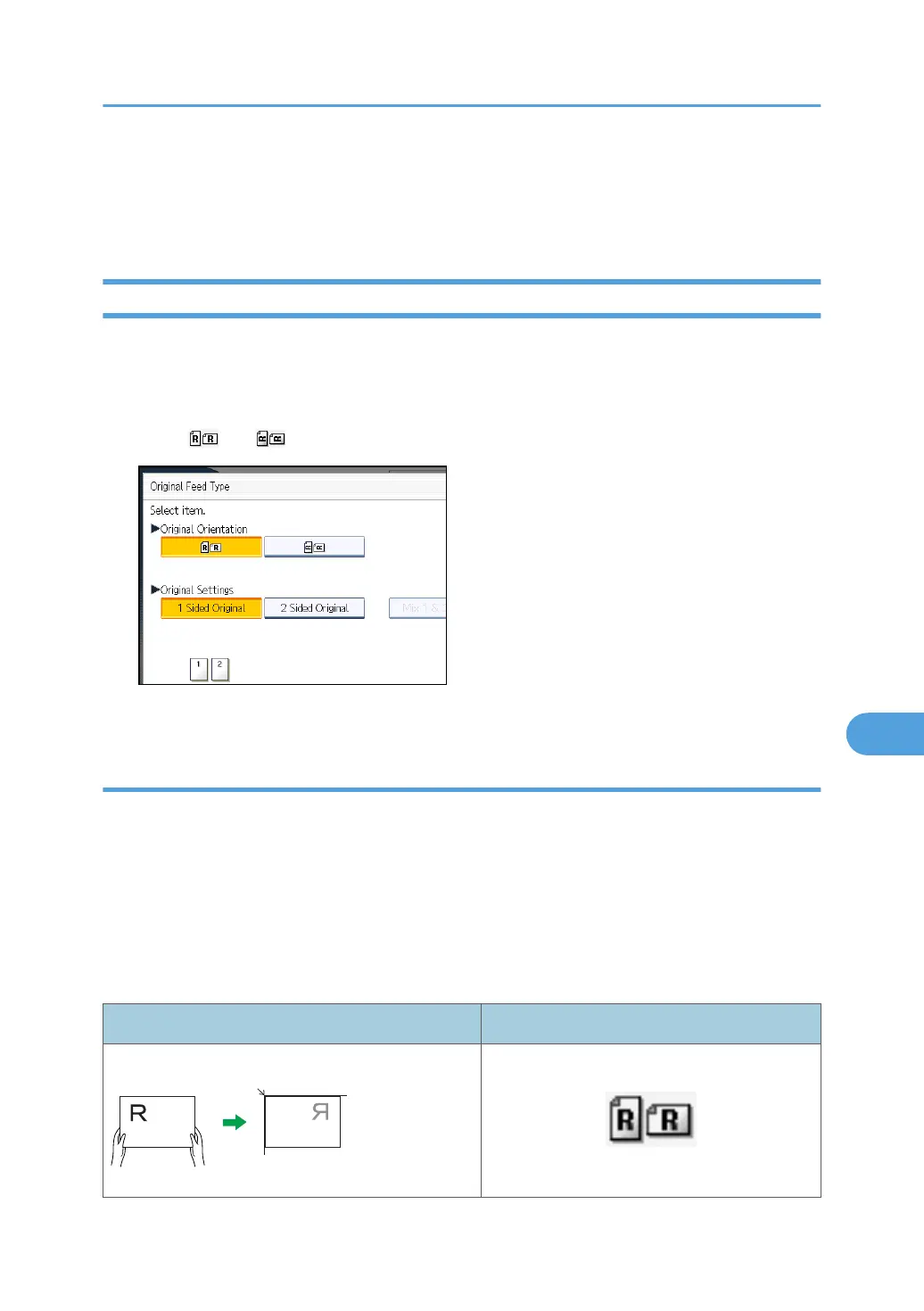 This section explains Original Feed Type settings such as orientation and scan sides of originals.