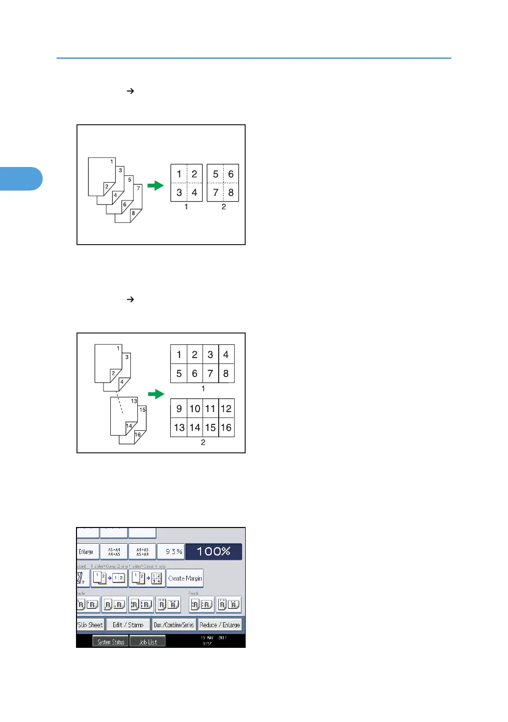 Copies eight 2-sided originals to one sheet with eight pages per side.