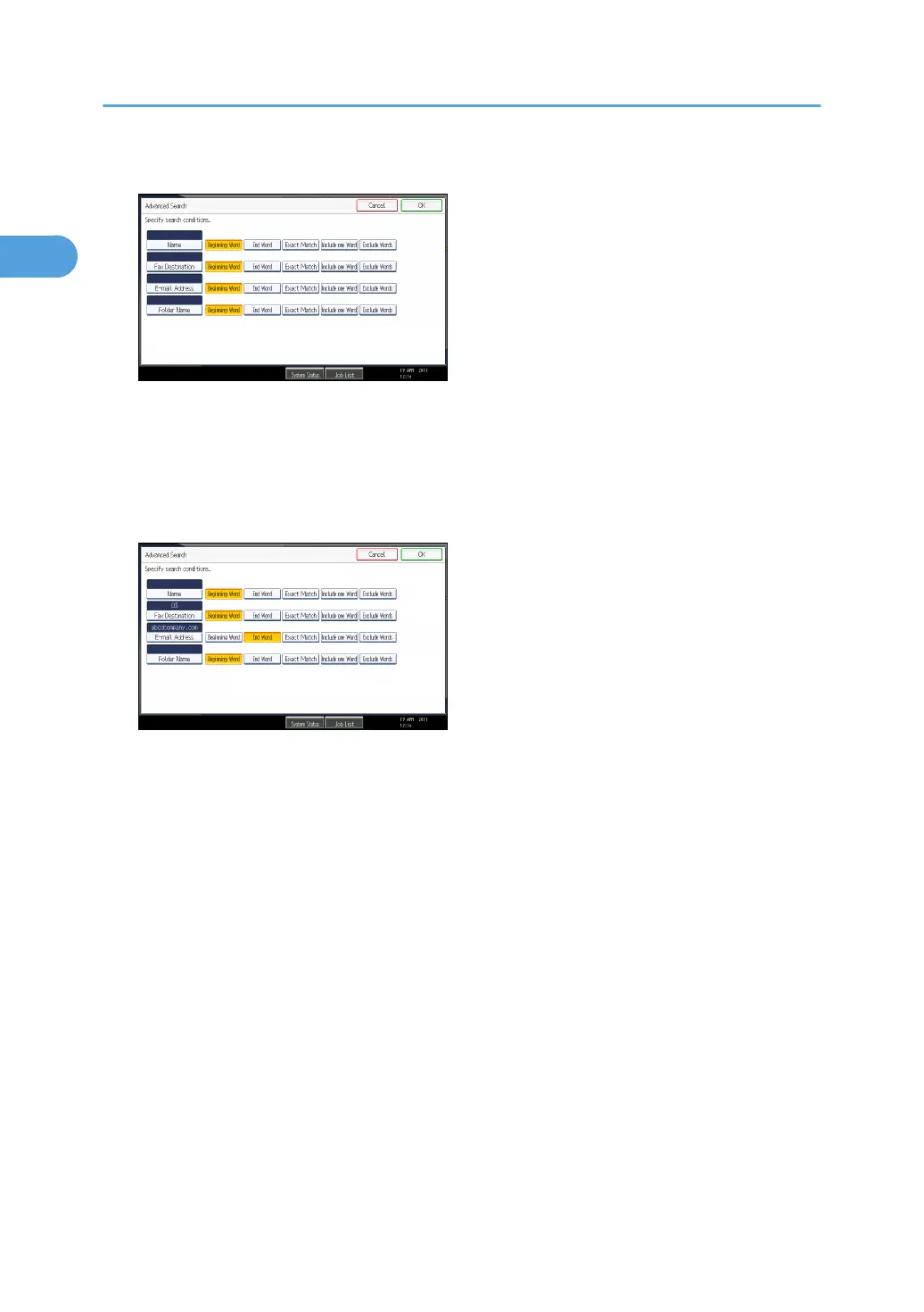 The following conditions can be specified for Address Book searches: Name, Fax Destination, E-