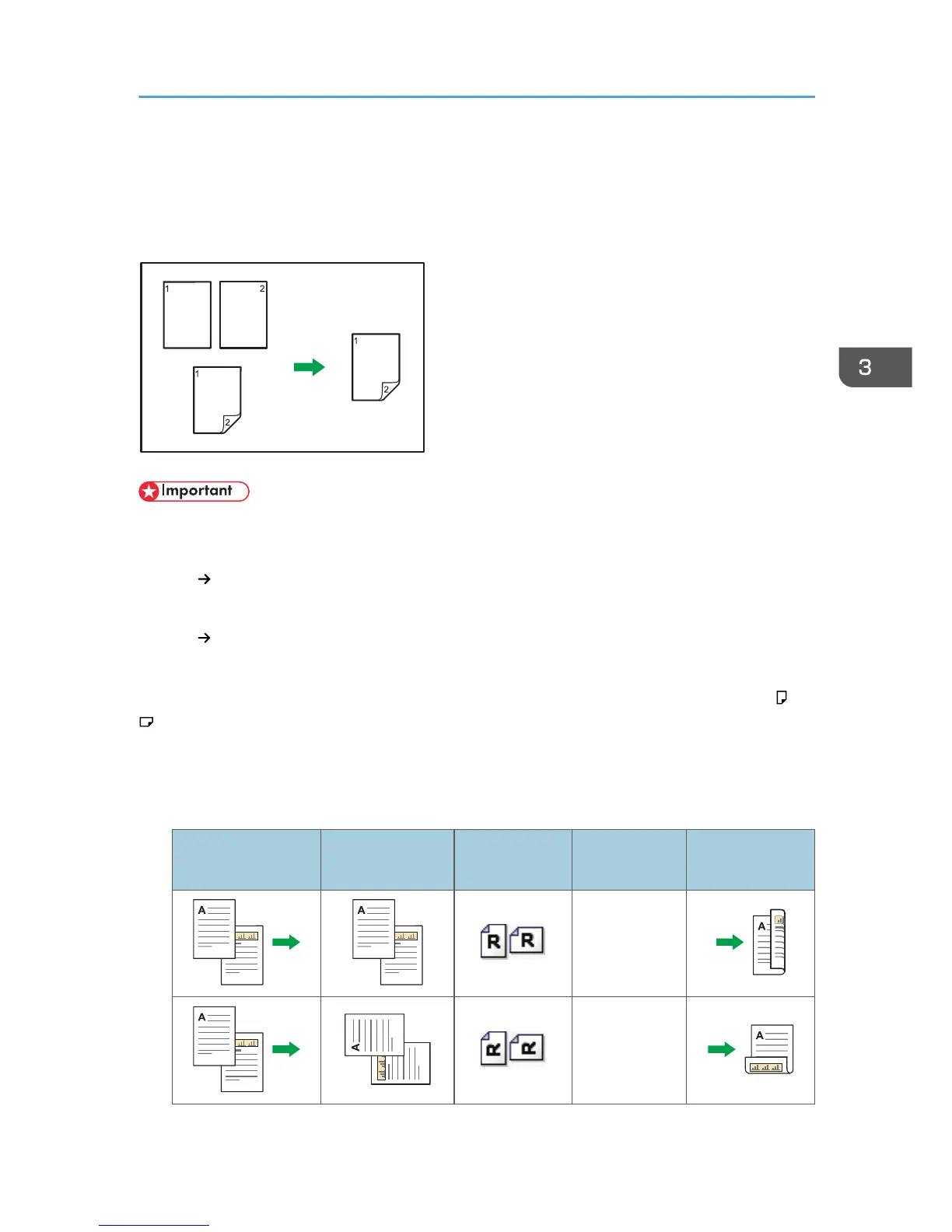 Copies two 1-sided pages or one 2-sided page onto a 2-sided page. During copying, the image is