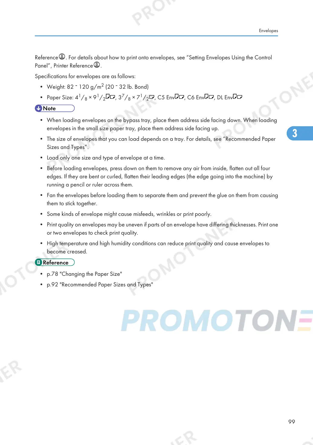 Reference . For details about how to print onto envelopes, see “Setting Envelopes Using the Control
