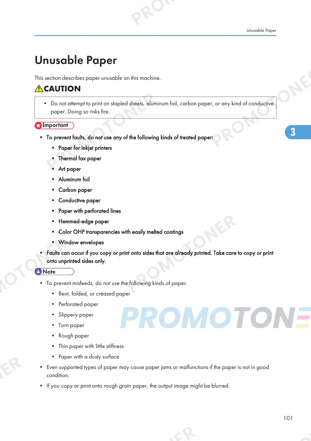 • To prevent faults, do not use any of the following kinds of treated paper: