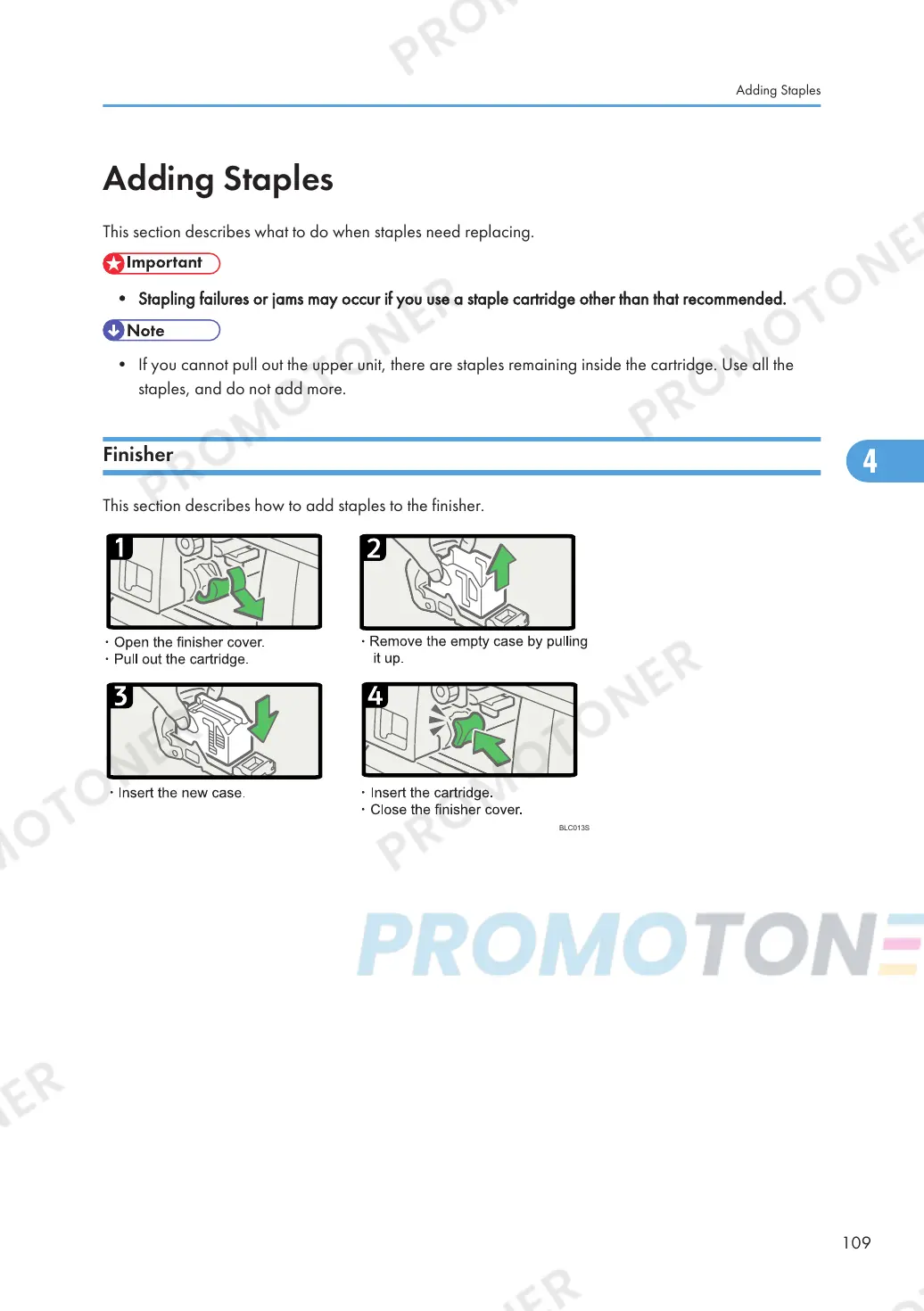This section describes how to add staples to the finisher.