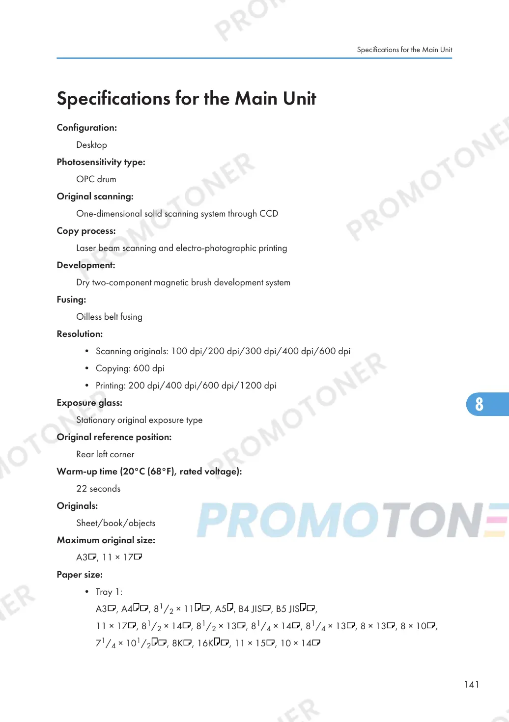 Specifications for the Main Unit