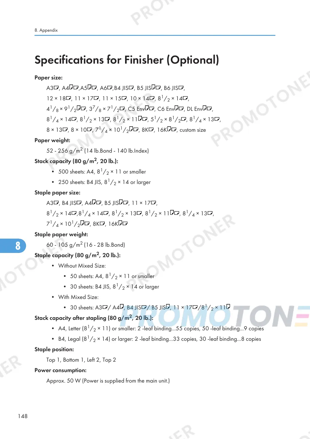 Specifications for Finisher (Optional)