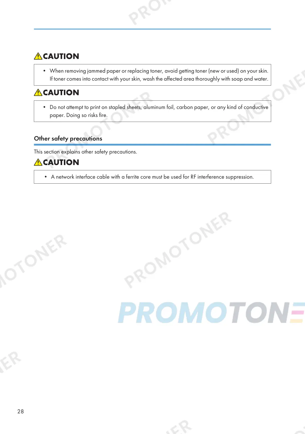 If toner comes into contact with your skin, wash the affected area thoroughly with soap and water.