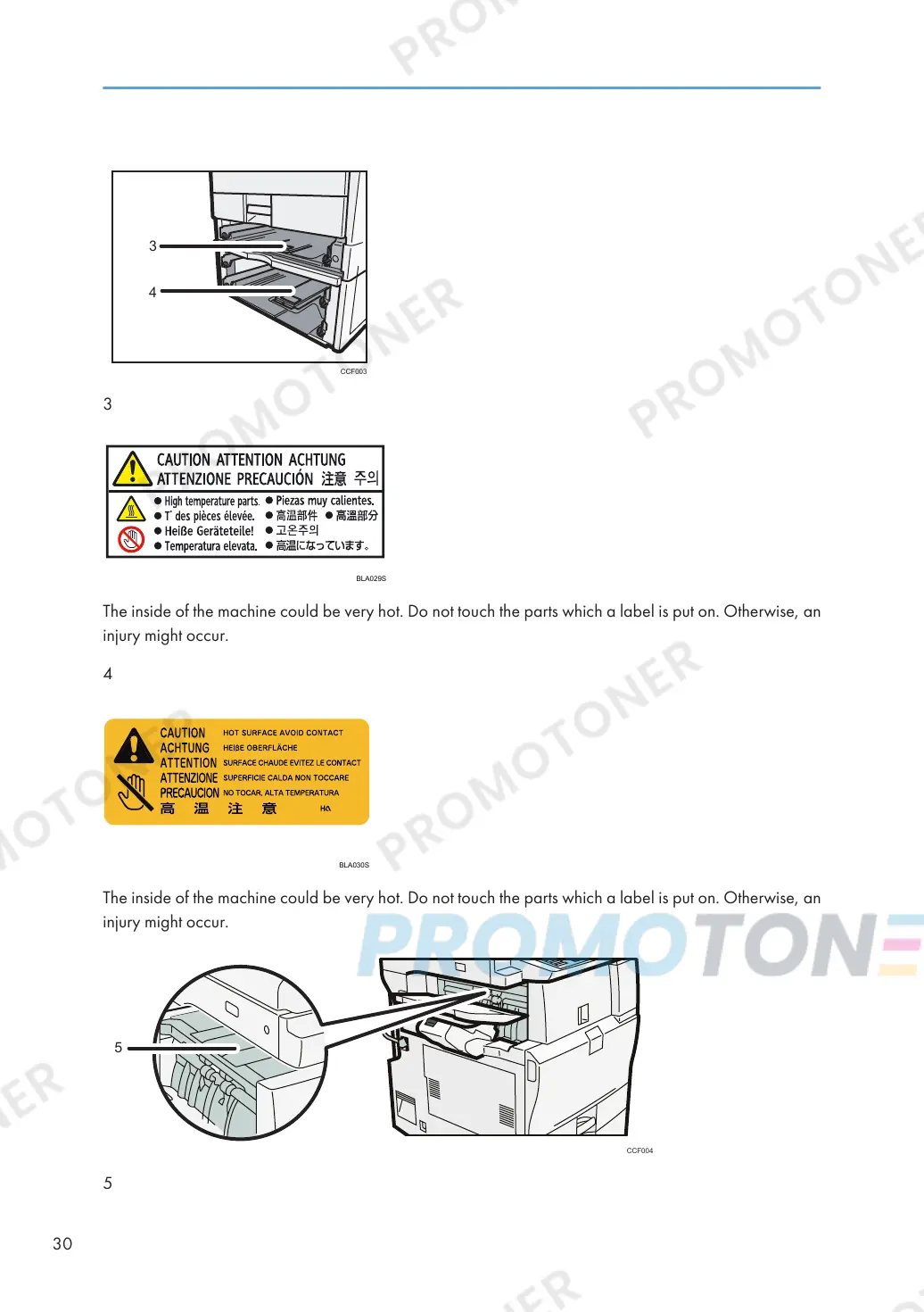 The inside of the machine could be very hot. Do not touch the parts which a label is put on. Otherwise, an