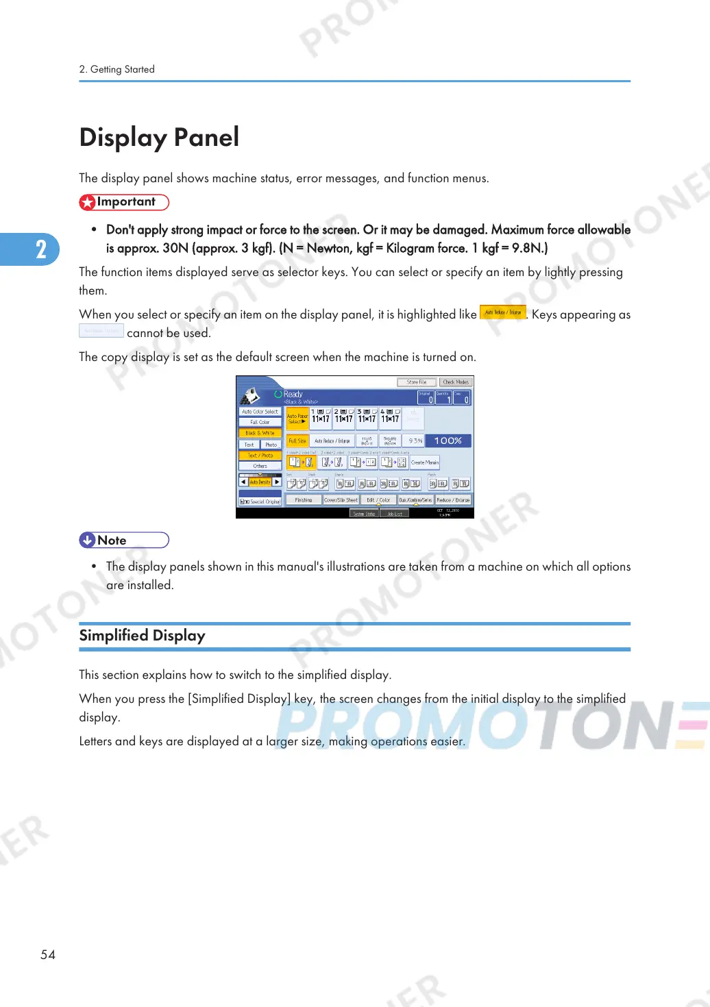 • The display panels shown in this manual's illustrations are taken from a machine on which all options