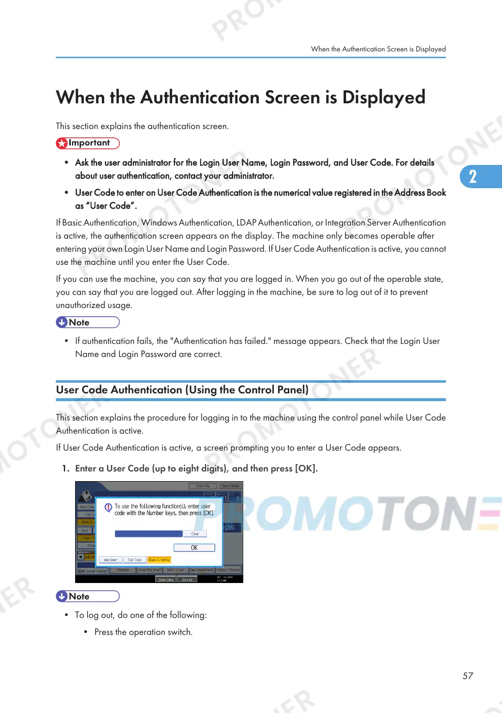 This section explains the procedure for logging in to the machine using the control panel while User Code