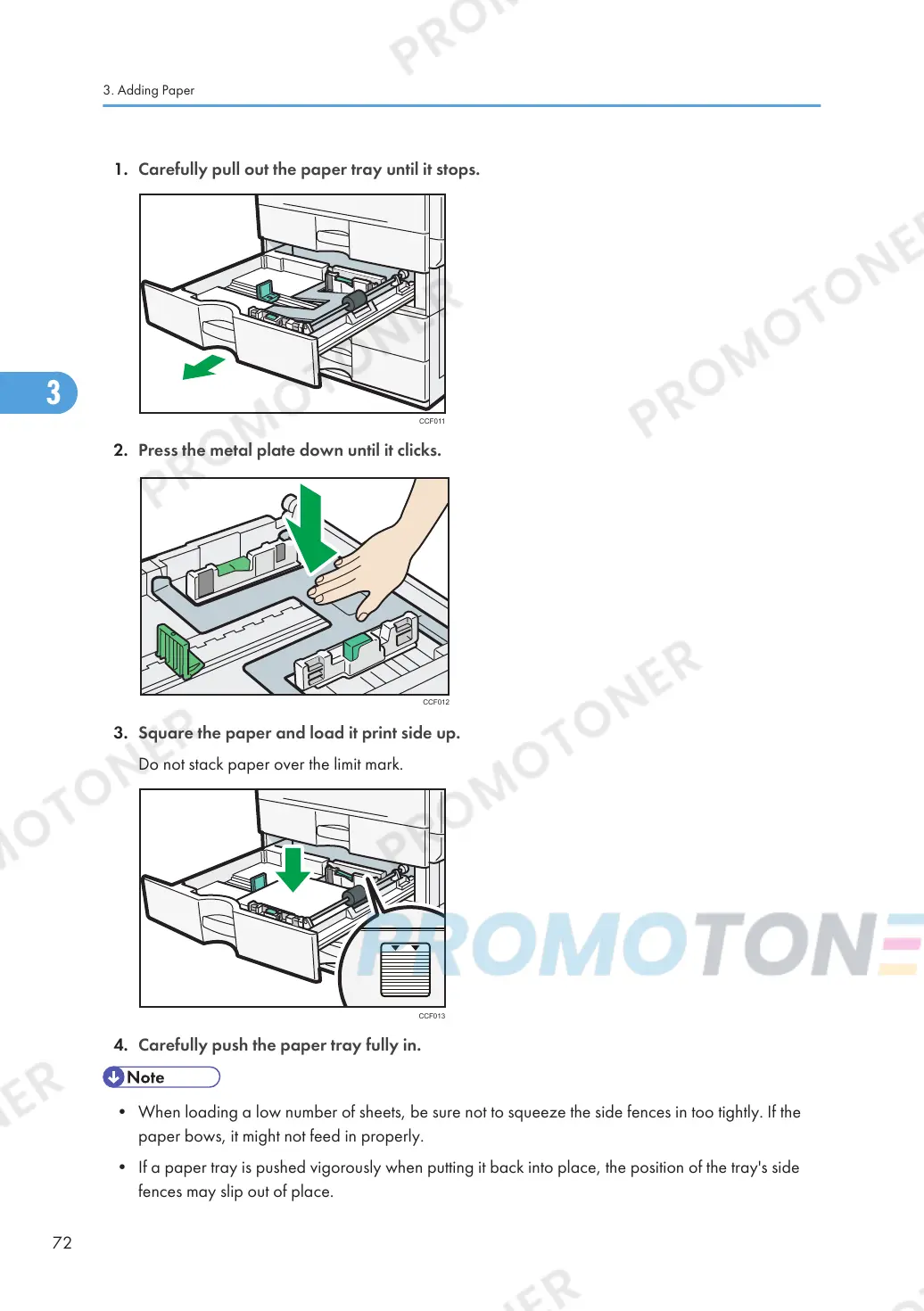 • When loading a low number of sheets, be sure not to squeeze the side fences in too tightly. If the