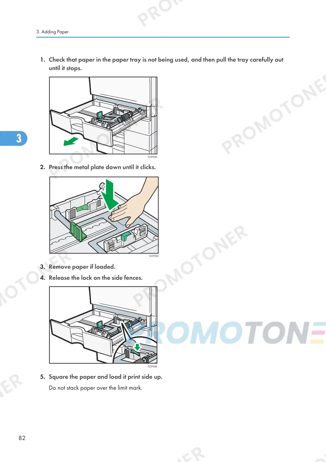 1. Check that paper in the paper tray is not being used, and then pull the tray carefully out