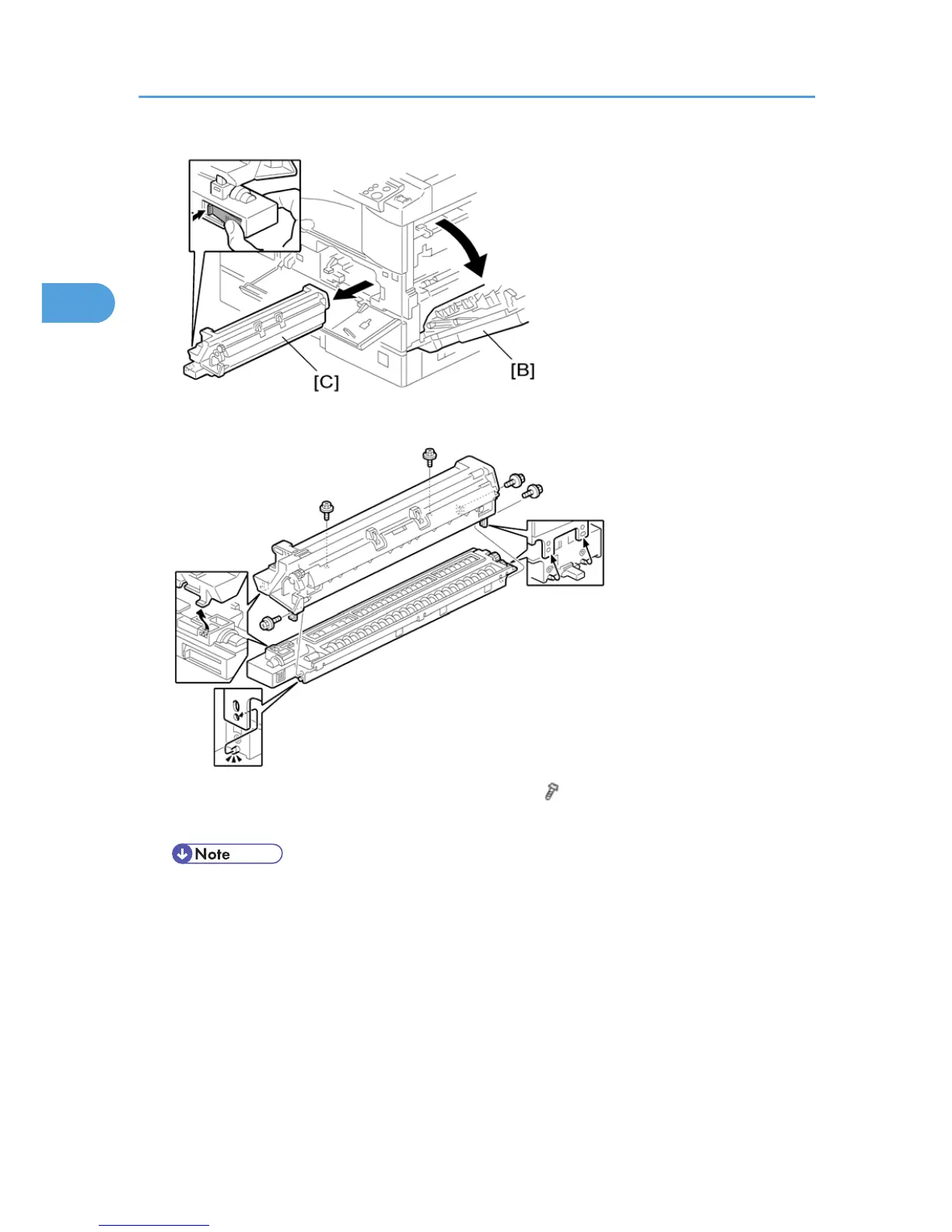 3. Open the right door [B], and remove the PCU (photoconductor unit) [C].