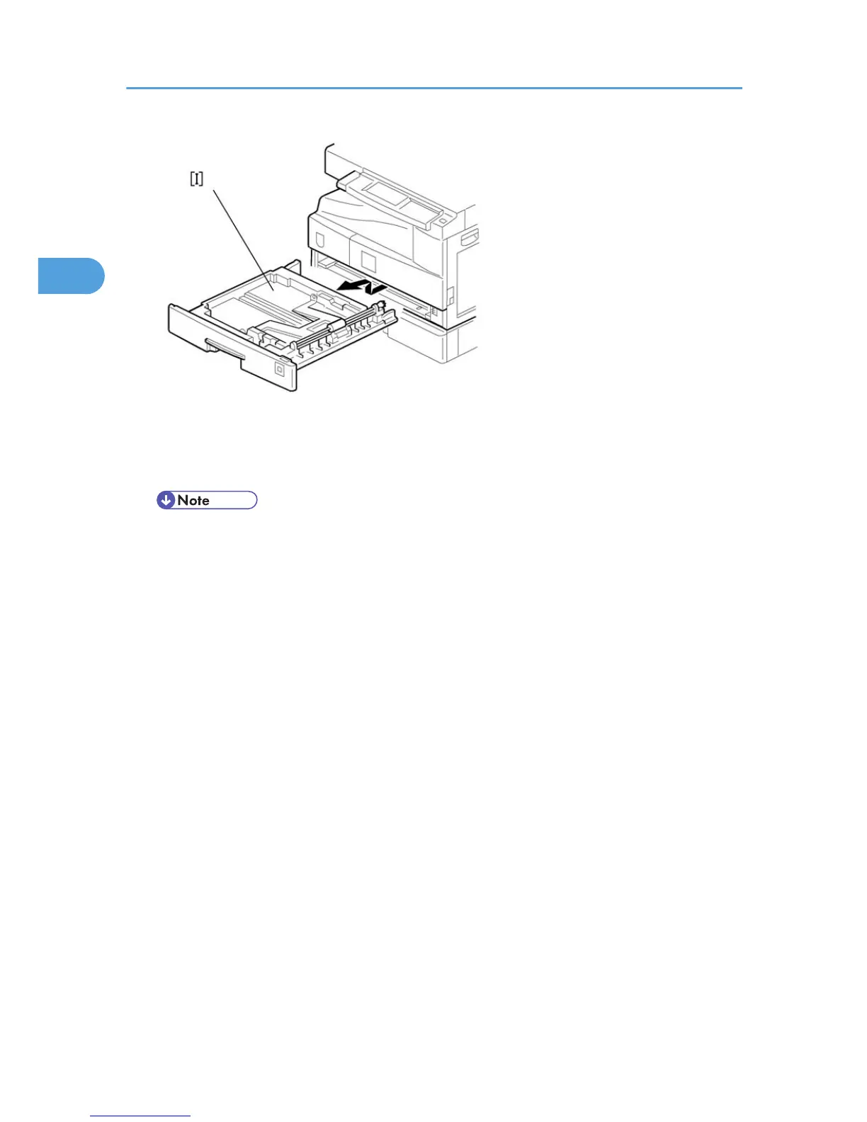 11. Pull out the paper tray [I] and turn the paper size dial to the appropriate size. Adjust the positions of