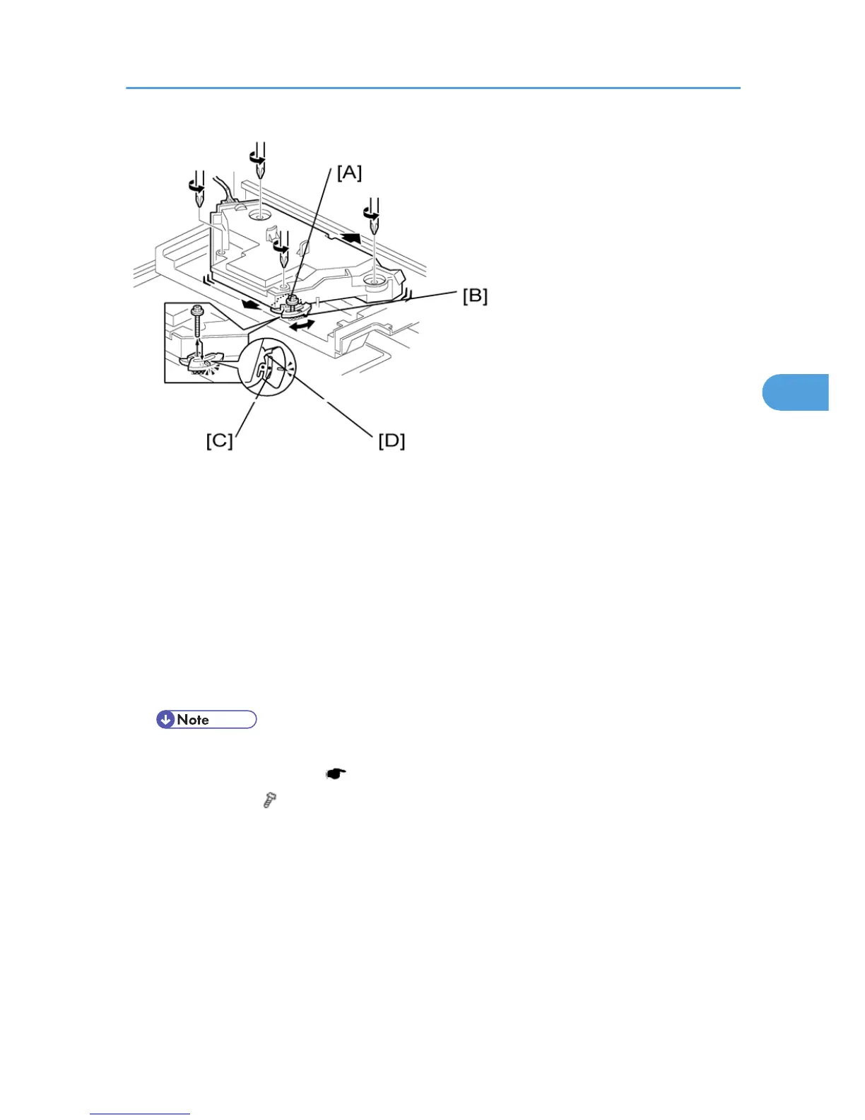 • If the screw is in the slot [D], loosen the screw on the lever, loosen the four screws on the laser