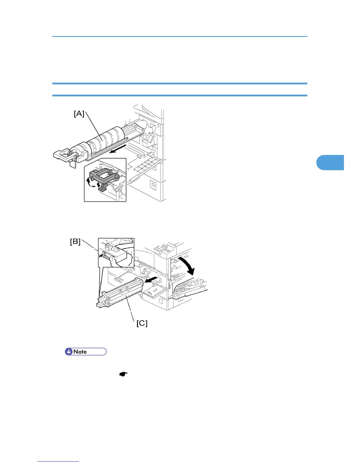 3. Press the latch [B] and pull out the PCU [C].