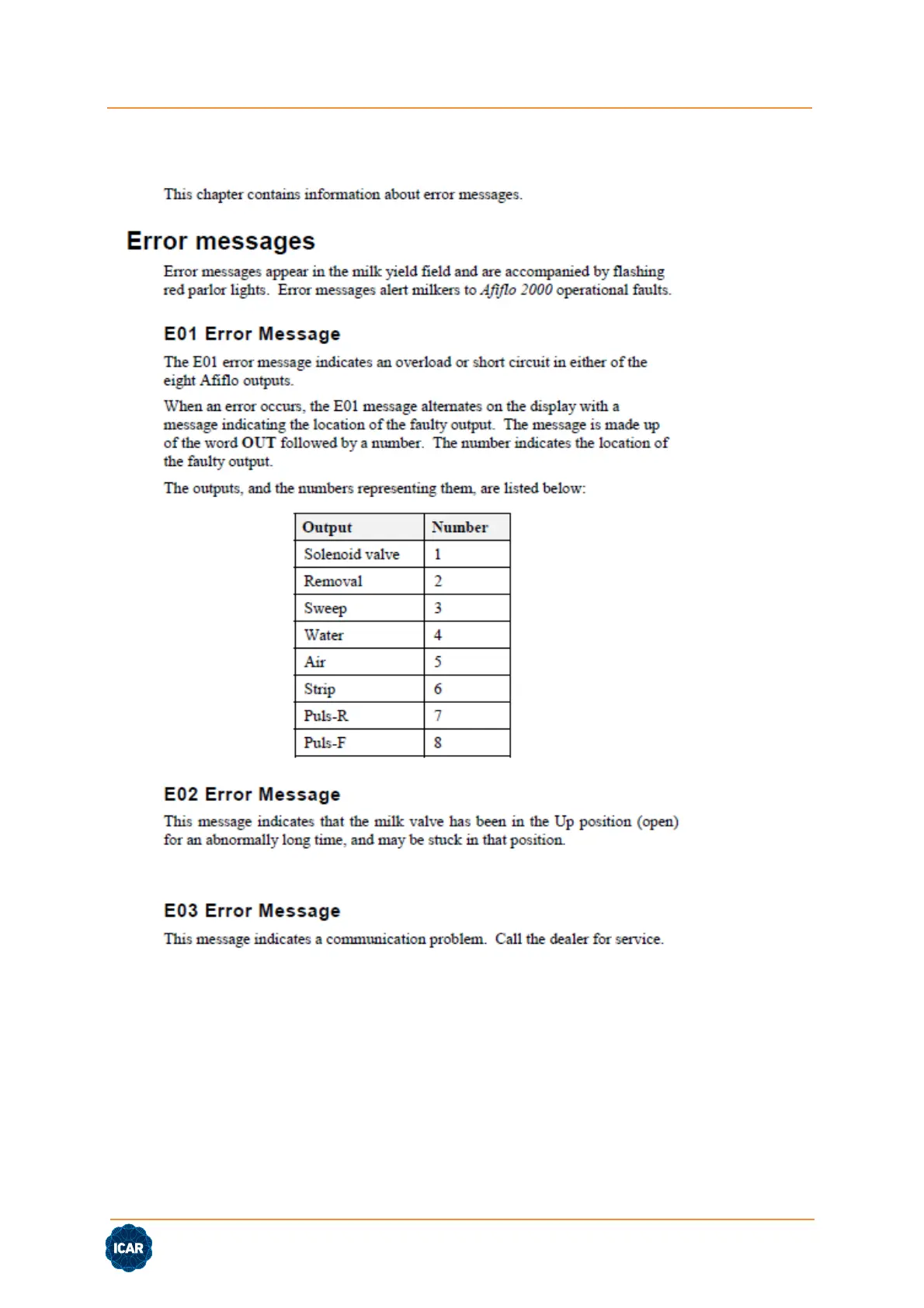 Afikim Afiflo 2000 - Chapter 7: Troubleshooting and Error Handling; Error Message Identification and Overview; Specific Error Codes (E01-E03)