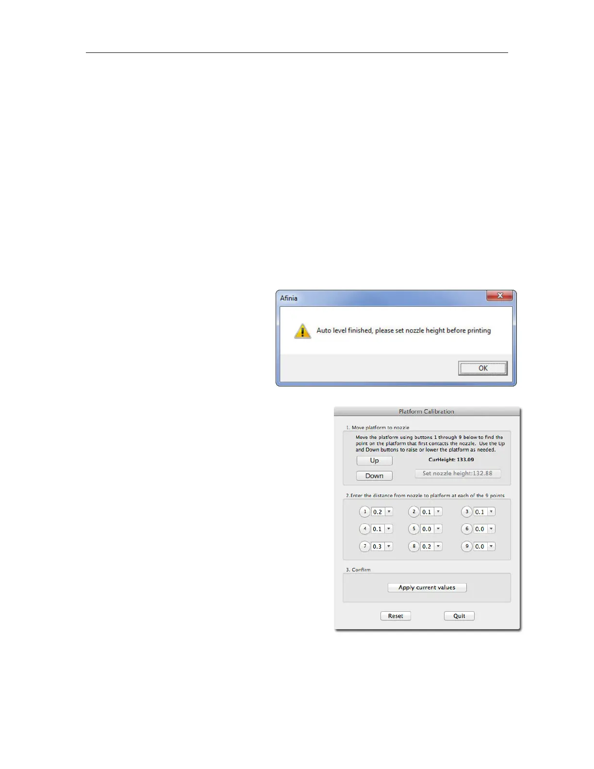 Along with manual leveling the platform, the Afinia software can run a Platform Calibration to