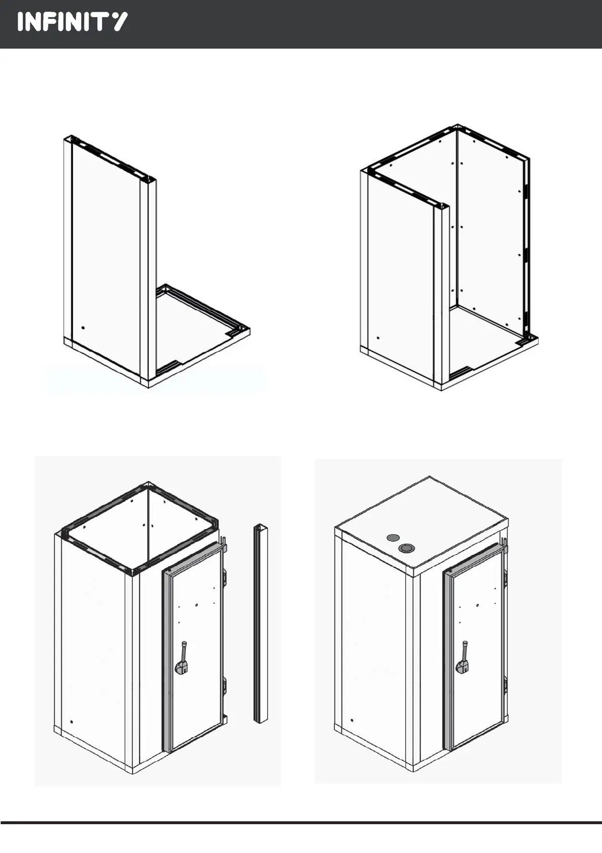 Fijar el panel puerta y cerrar con el montante frontal Por último, fijar el techo y aplicar los tapones