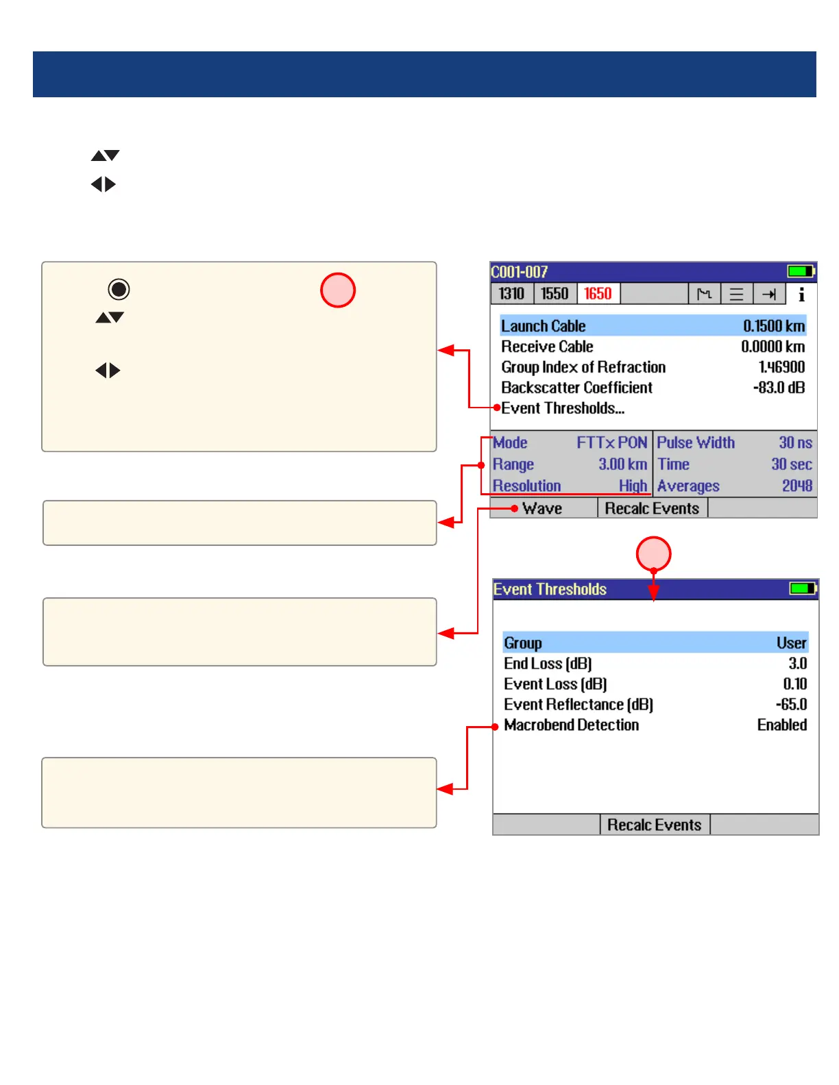 keys to change the highlighted setup parameter (except [Event Thresholds…] parameter). You may