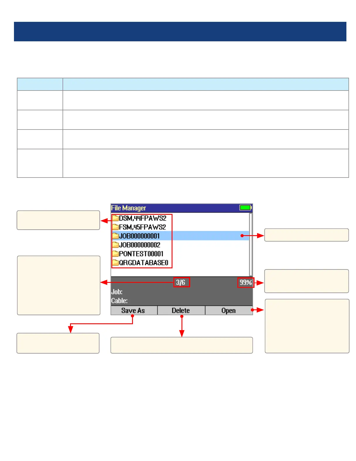 Save As Lists the current job, the current cable, and the ber number that will be used the next time a