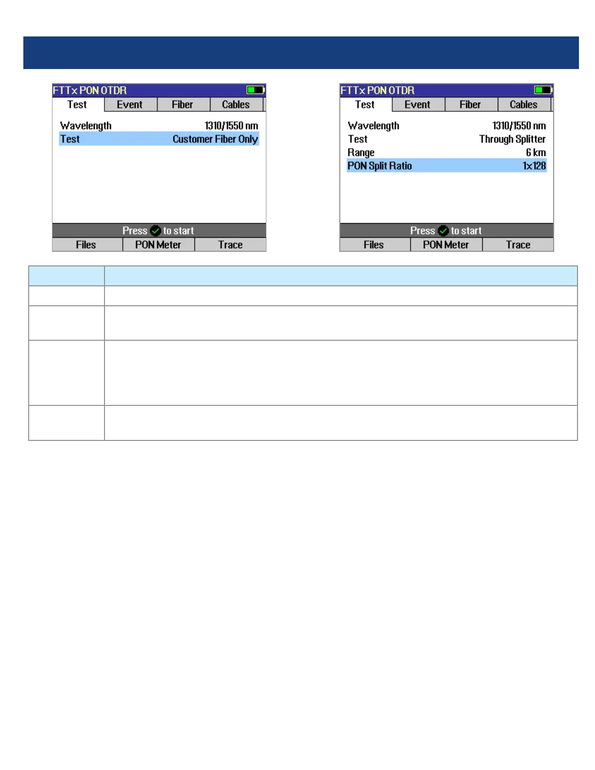 Parameter FTTx PON OTDR Test Mode
