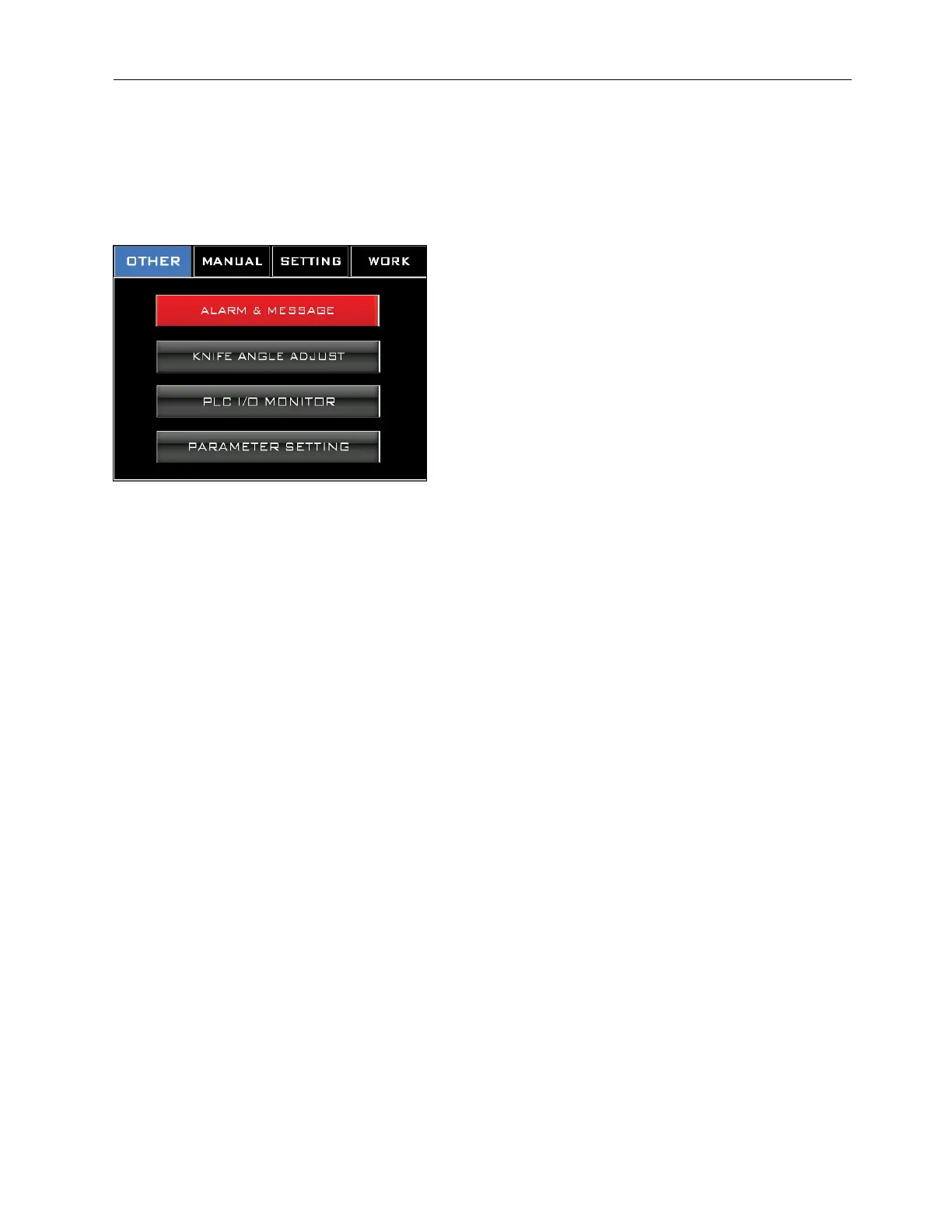 This is a portal through which the Alarm & Message Screen, the Knife Angle Adjust Screen,