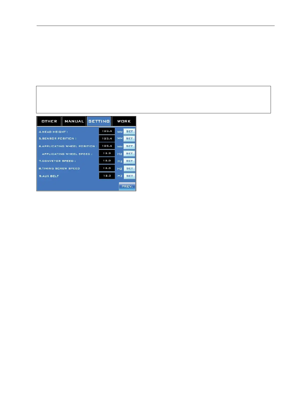 Setting Screen 2 displays some general parameters for the currently selected recipe. Many of