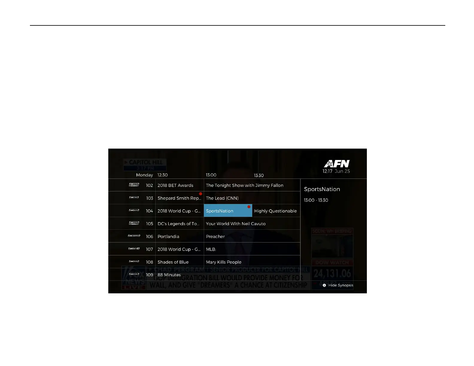Press the ‘EPG’ button and navigate to the program you wish to record. To record the program, press the [REC] button. A red dot will