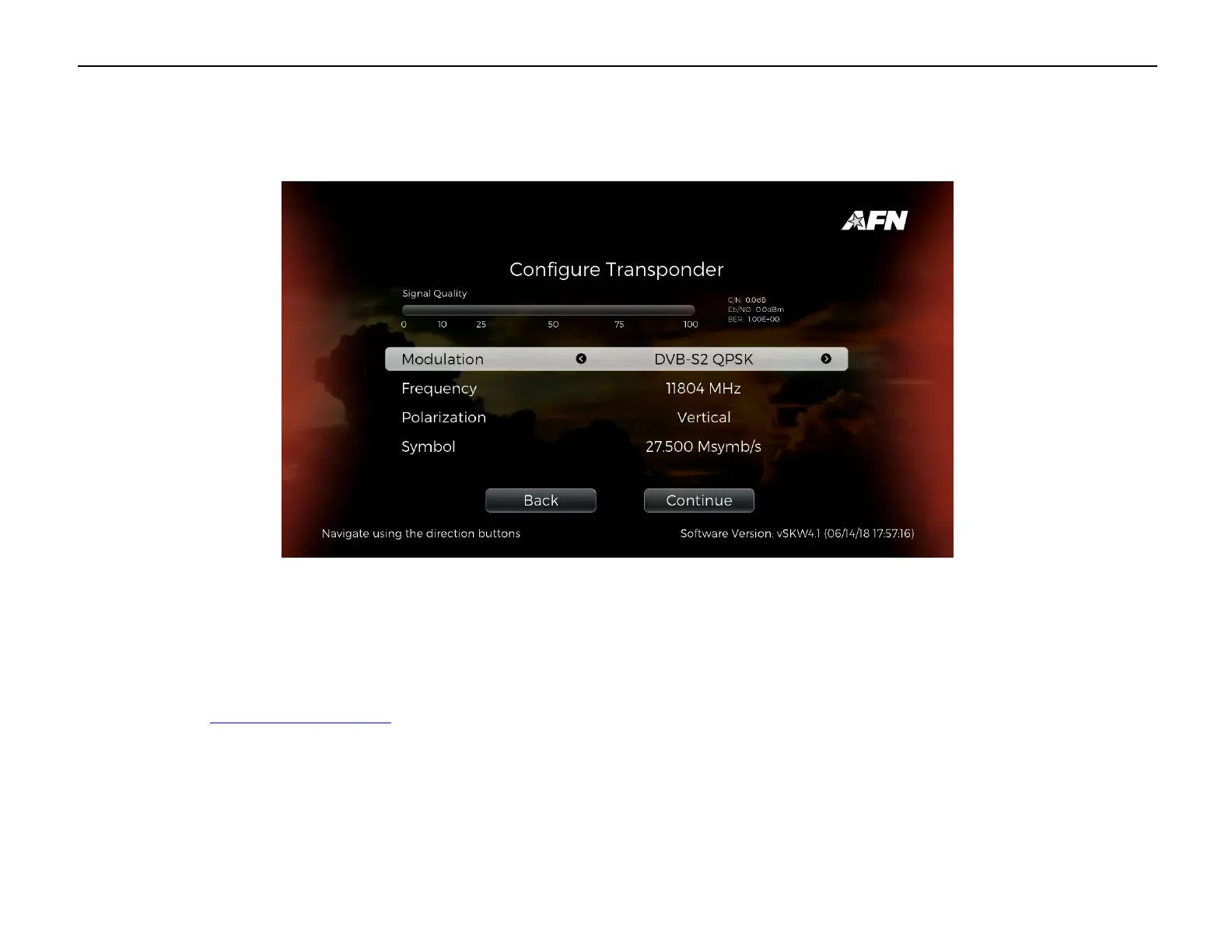 If Transponder is set to Manual, make sure the ‘Modulation’, ‘Frequency’, ‘Polarization’, and ‘Symbol’ are correct and select ‘Continue’.