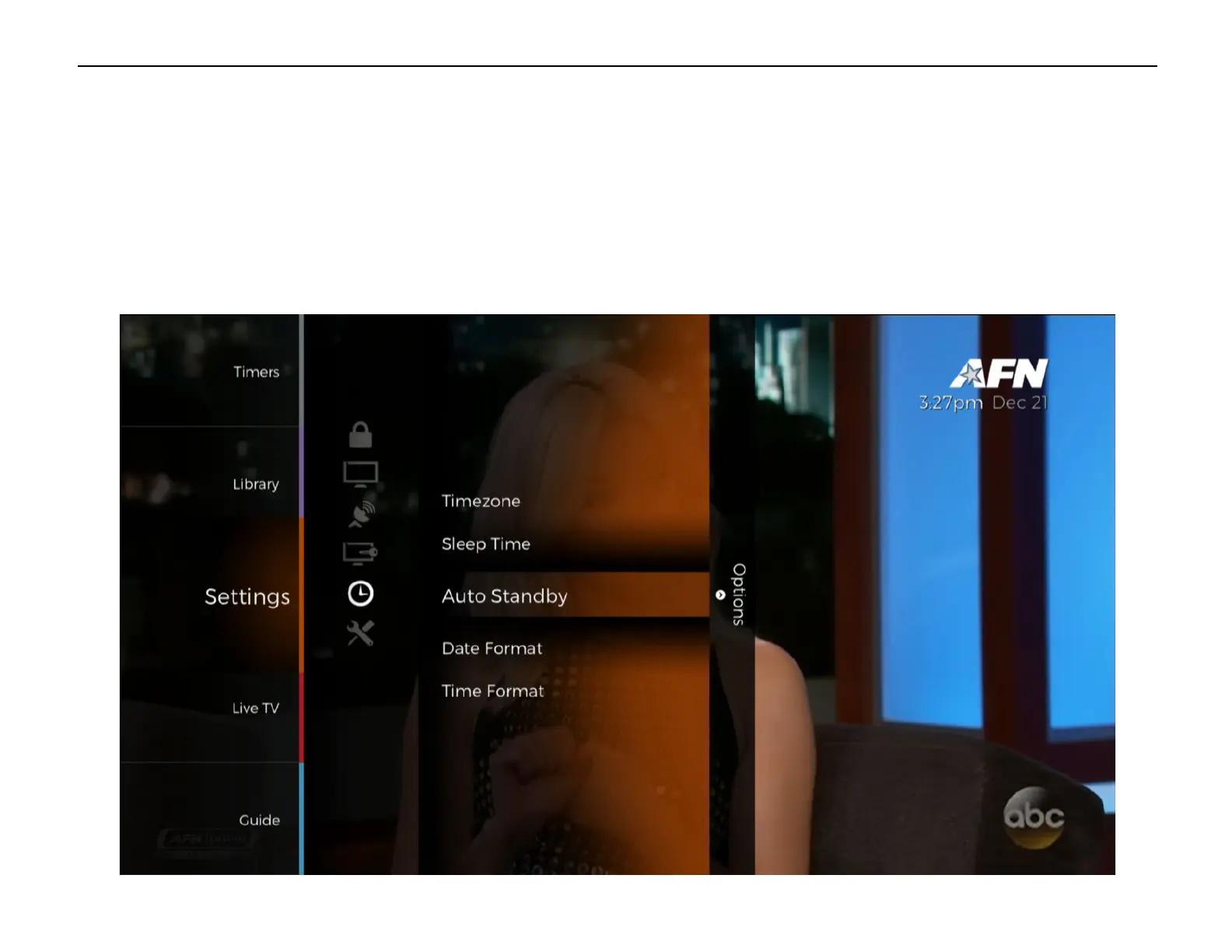 The Auto Standby settings can be found under [Menu] > ‘Settings’ > ‘Time’ > ‘Auto Standby’.
