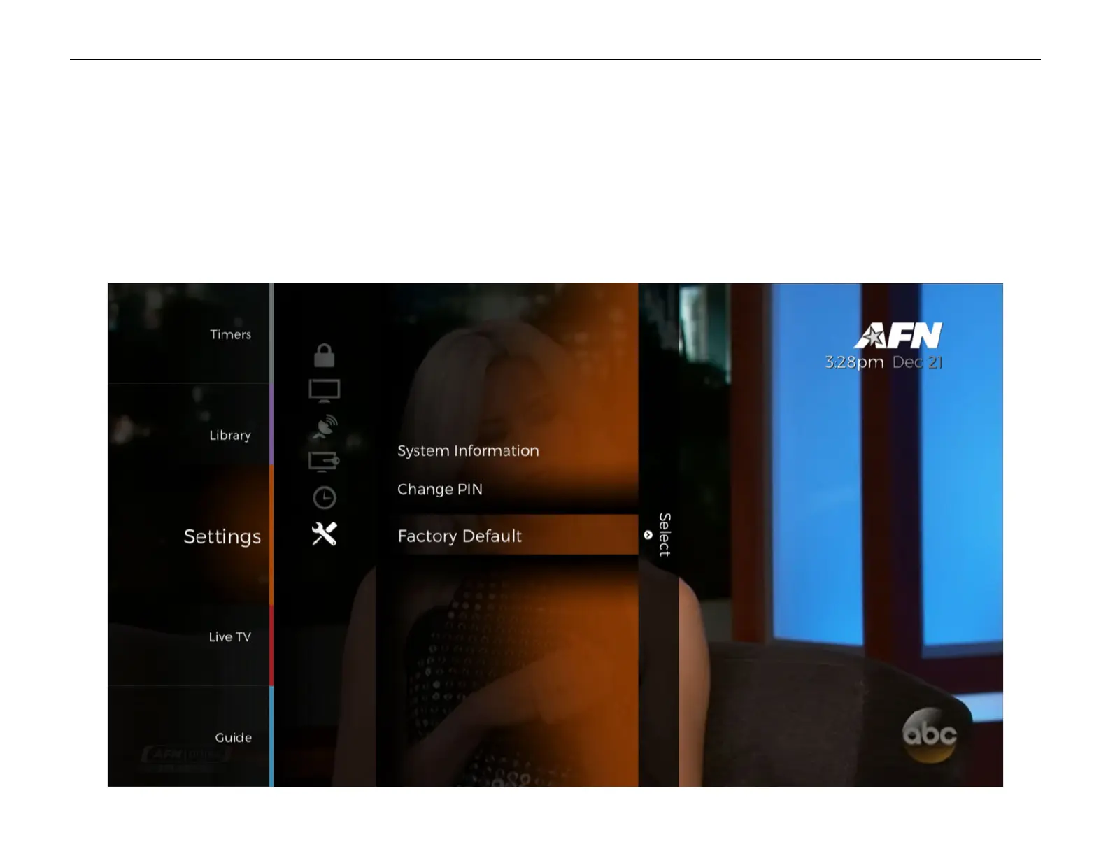 The Factory Default settings can be found under [Menu] > ‘Settings’ >System’ > ‘Factory Default’.