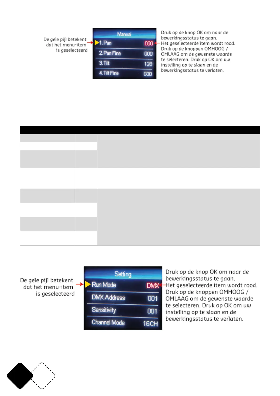 1CH. Pan 0-255 De gele pijl betekent dat het menu-item is geselecteerd.