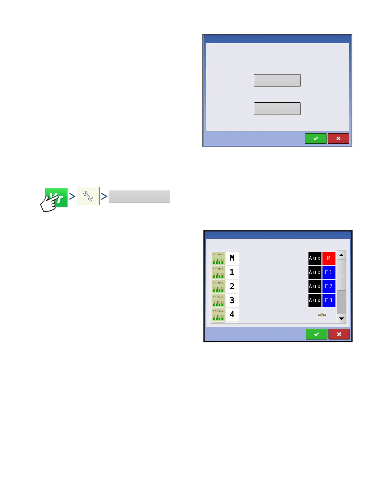 Press: Virtual Terminal (VT) button > Setup (wrench) button > Auxiliary Assignments button