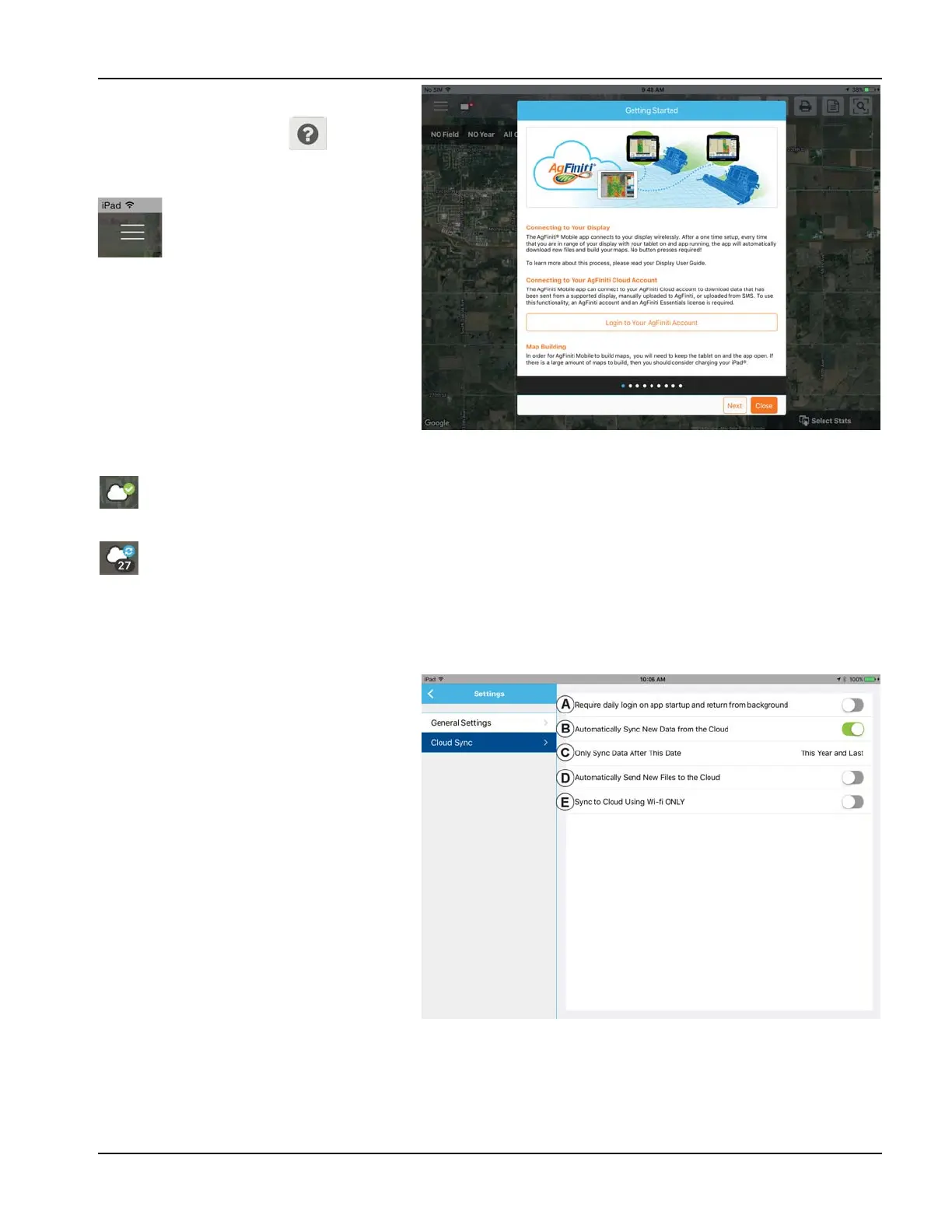 Indicates that data is being synced to/from AgFiniti Cloud. Once the data is synced to the app, an icon indicating