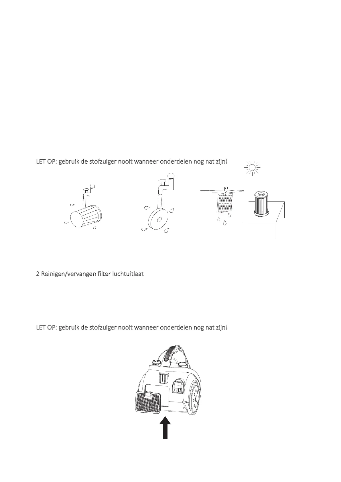 ET OP gebrui de stofzuiger nooit wanneer onderdelen nog nat zijn!