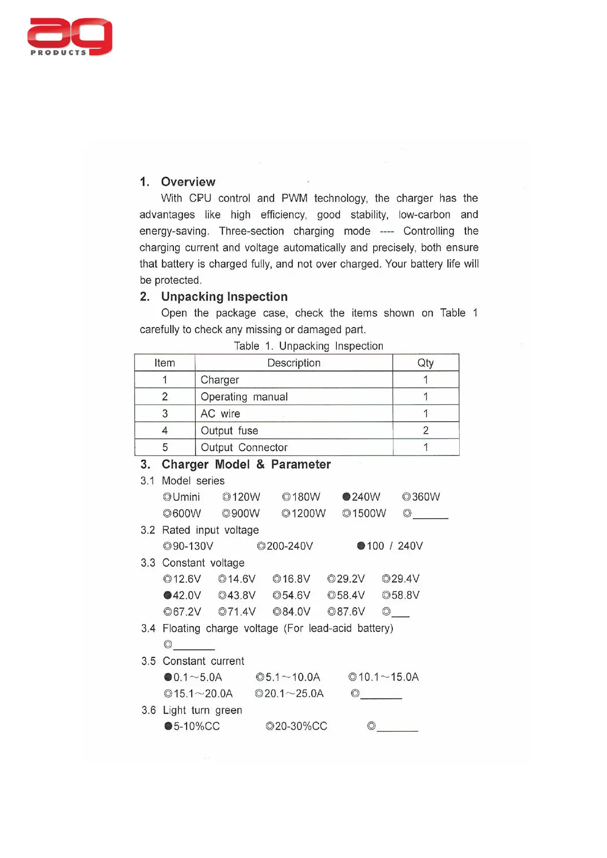 AG Duo - 9 BATTERY CHARGER OPERATING MANUAL; 9.1 OVERVIEW; 9.2 UNPACKING INSPECTION
