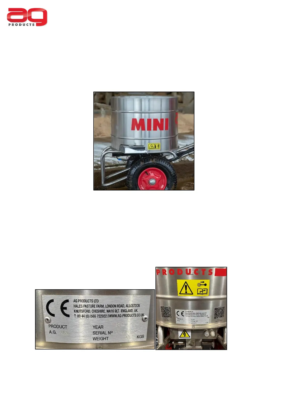machine, facing the handlebars. The serial plate includes AG Products details and contact