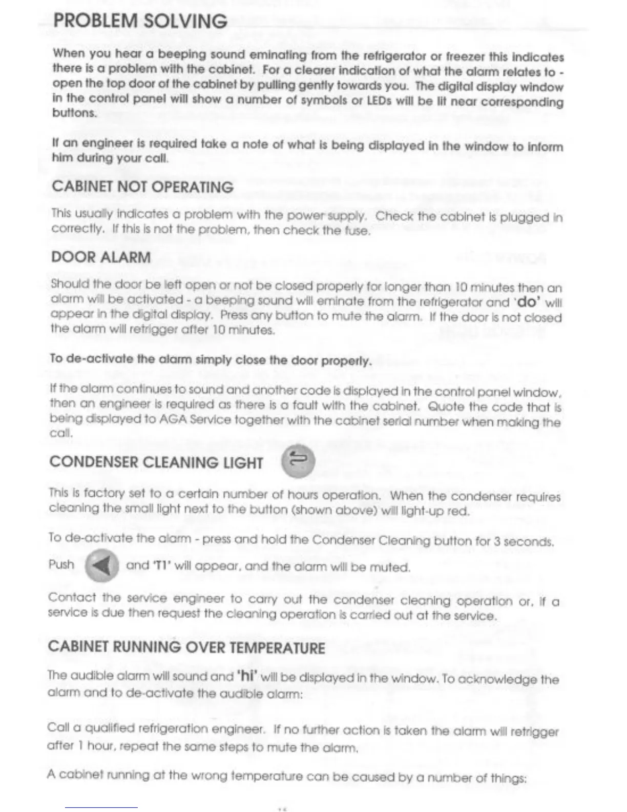 AGA R2 - PROBLEM SOLVING; CABINET NOT OPERATING; DOOR ALARM; CABINET RUNNING OVER TEMPERATURE