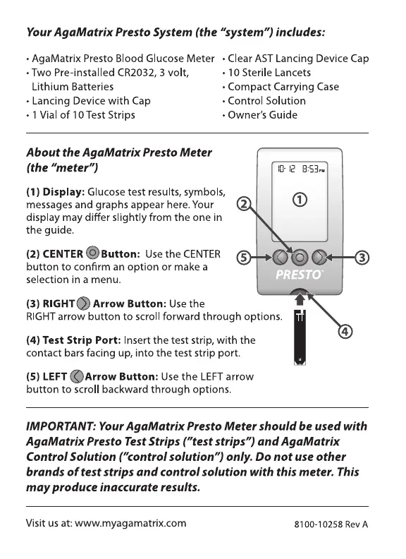 AgaMatrix Presto - AgaMatrix Presto Meter Overview; Meter Components and Display