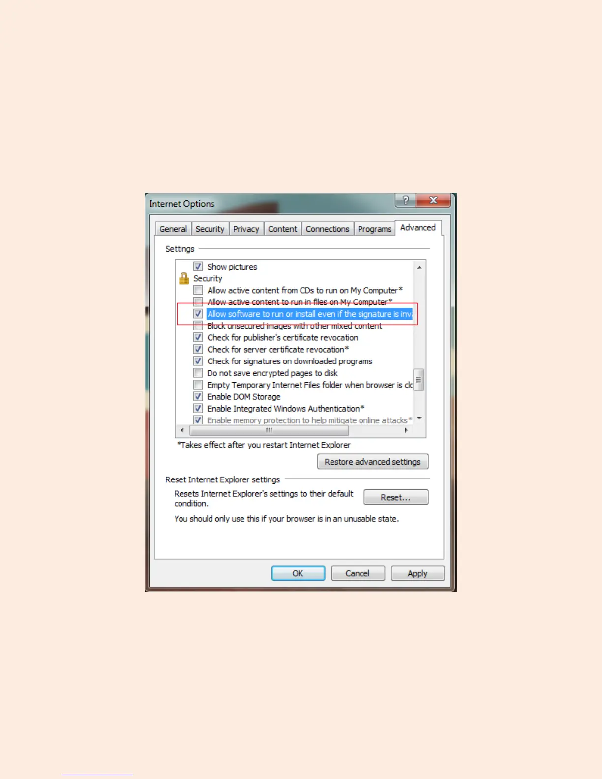 Check the option which states “Allow software to run or install even if the signature is invalid.” This is