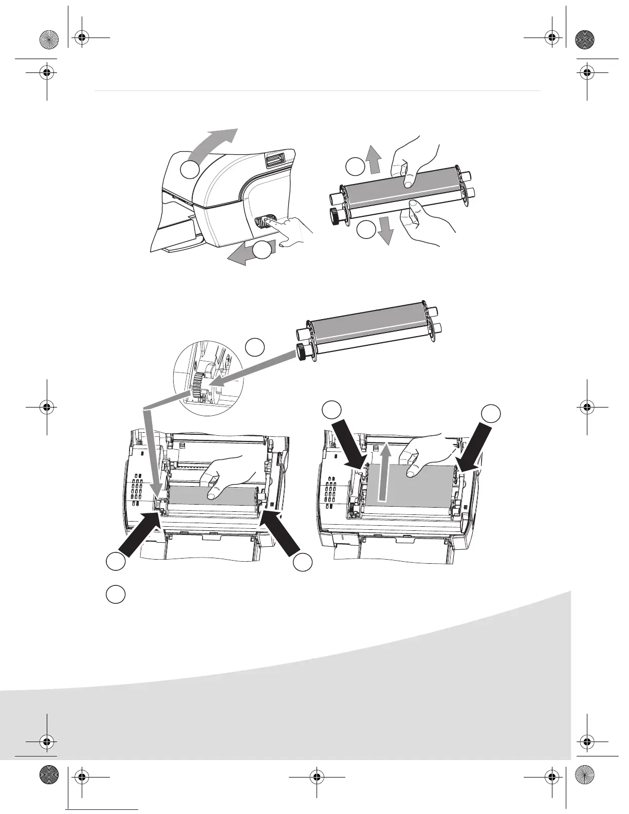 Spänn bandet över dessa axlar (6) och stäng skrivaren.