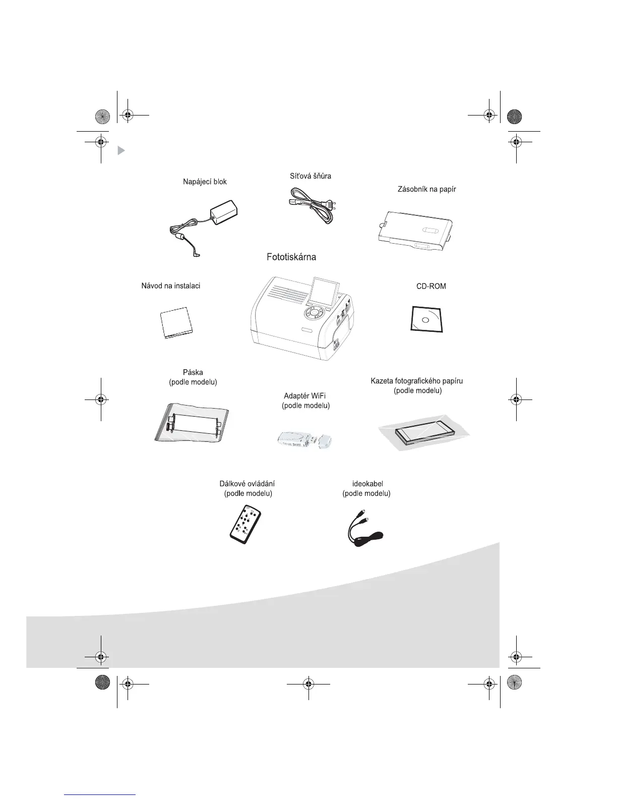 Položte balení před vás, vyjměte součásti vaší tiskárny a zkontrolujte, že máte všechny tyto součásti: